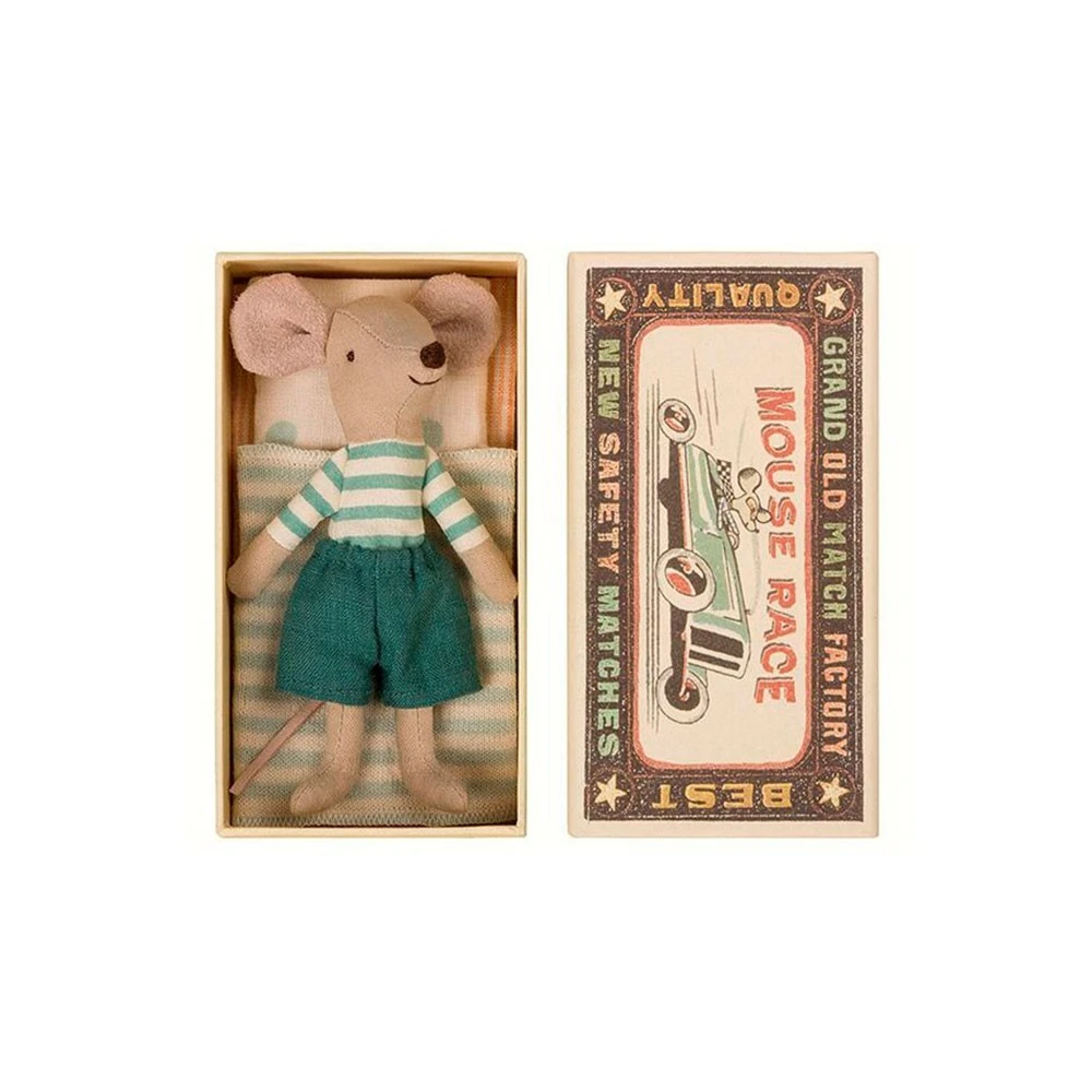 Delicious little mouse dressed in a striped shirt and pants, bedding, and his box of matches – bed. It is adorable. It measures 12 cm. Washable at 30 degree C.