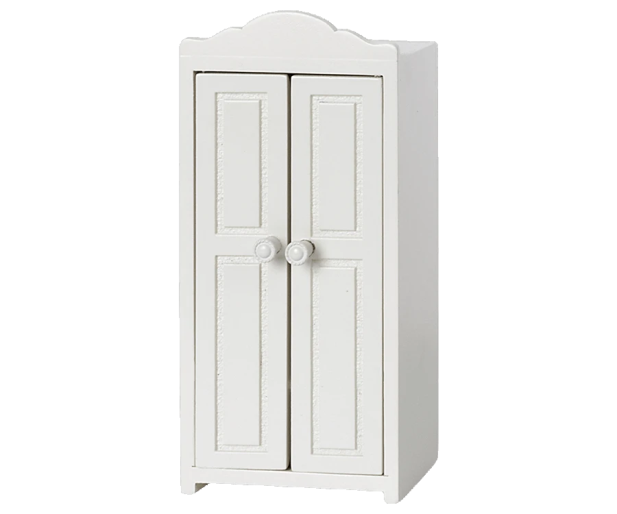 Un petit placard en bois FSC. Il aide la famille des souris à organiser leur garde-robe. Le placard est livré avec 3 cintres dorés.