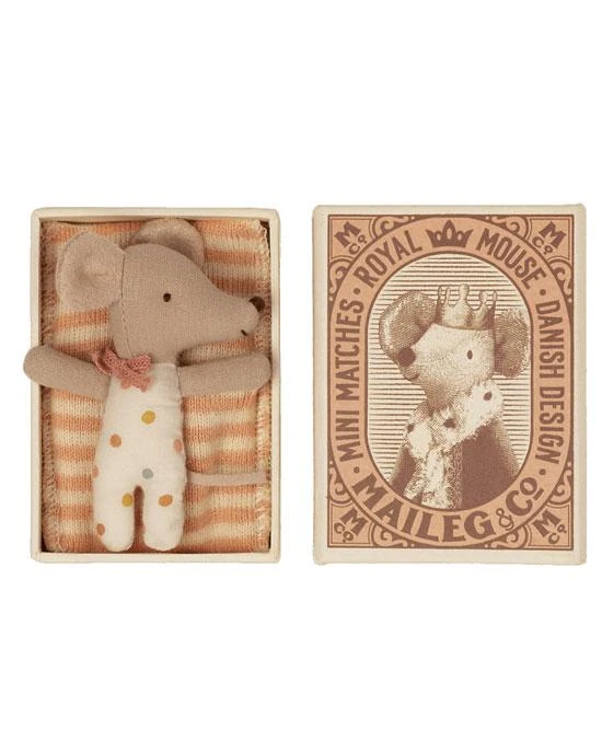 A classic Maileg item. This mouse is ready for hours of play and sleeps tight in her little matchbox. The clothes and bed linen are made of soft fabrics with unique prints and beautiful colors. Size: Baby mouse Height : 8 cm Age: All ages Washing instruction: 30 degrees Material: Cotton About Maileg In a busy world of bright lights, bells and whistles, where new stories are continually impressed upon us… Maileg is a world in which matchboxes can be beds for mice; princesses make perfect teatime companions; and adventures can be found on a friendly forest walk. It is a world where cats and mice are friends. Ours is a world of childhood imagination – and this is a world we value. Maileg (pronounced My’lye) is a brand of charming Danish-designed toys created to inspire our children’s favorite playtime stories. By bringing storybook whimsy to everyday moments, Maileg toys help children explore the pure and simple wonder of imagination. Beloved for their heartwarming personalities, Maileg toys show playfulness and charm in every last detail. Theirs is a timeless world filled with beautiful accessories and settings to be collected, cherished and shared with friends and family for generations.