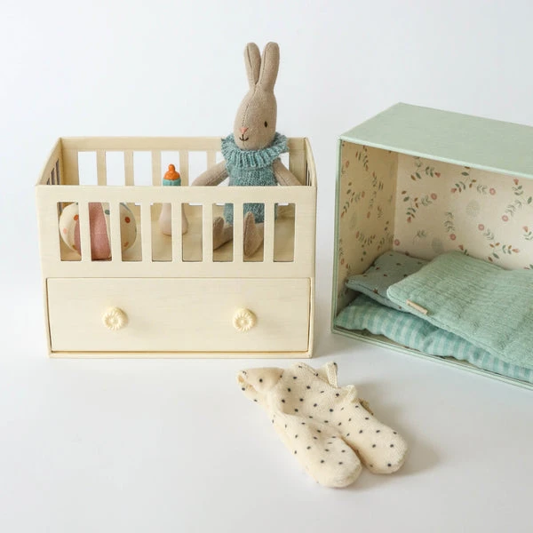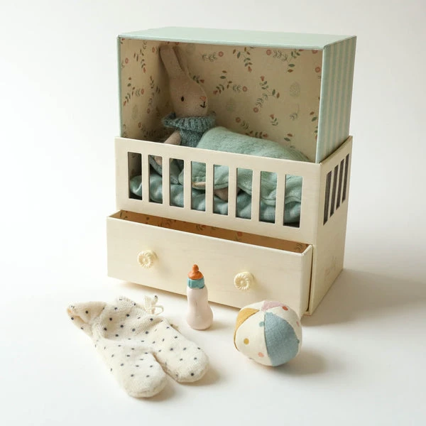 This sweet playful set contains a micro rabbit, baby room box, baby suit, ball, and a baby bottle. Everything you need for the perfect play and storytelling about a baby. Maileg is a brand of charming Danish-designed toys created to inspire our children’s favourite playtime stories. By bringing storybook whimsy to everyday moments, Maileg toys help children explore the pure and simple wonder of imagination. Beloved for their heartwarming personalities, Maileg toys show playfulness and charm in every last detail. There is a timeless world filled with beautiful accessories and settings to be collected, cherished and shared with friends and family for generations. Size: Micro Height: 15 cm Width: 17 cm Recommended age: +3 Year Wash: 30°C Material: Cotton/Linen