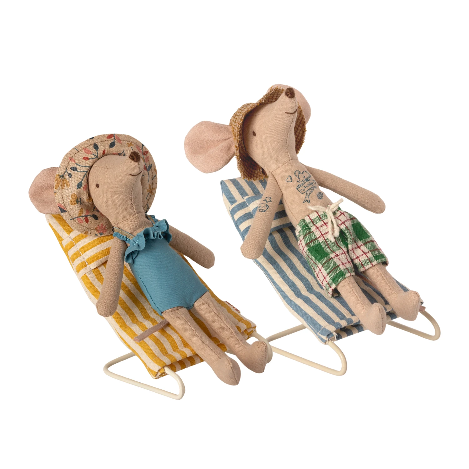 Vacation time. Bring these lovely striped beach chairs to the beach, and you will always have a perfect seat for your mice. One is yellow and white striped and the other, blue and white striped. Both have a built in head cushion so your mice can relax under the sun and have the perfect day.