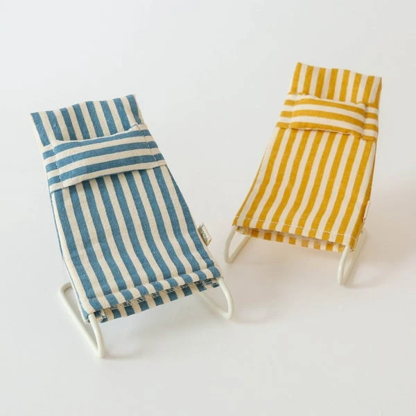 Vacation time. Bring these lovely striped beach chairs to the beach, and you will always have a perfect seat for your mice. Size: Mouse Height: 5 cm Width: 5 cm Age: 3 YR + Wash: Fabric 30°C Material: Metal/Cotton Filling: –