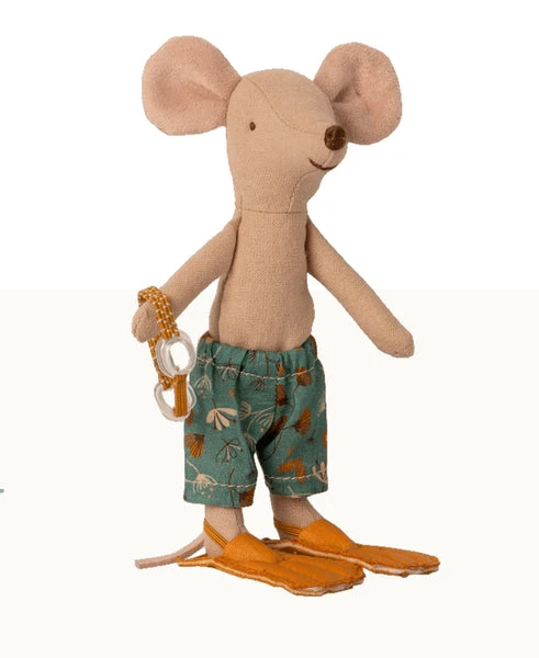 Vacation time. The perfect play set for the beach. A Big brother mouse, with the cutest goggles, swimming trunks and flippers, with a striped towel and, in a striped beach hut with window. Size: Big brother/sister mouse Height: 15.5 cm Width: 7.5 cm Age: All ages Recommended Agegroup: +3 Year Wash: 30°C Material: Cotton Filling: Polyester/Pe Pellets Maileg is a world in which matchboxes can be beds for mice; princesses make perfect teatime companions; and adventures can be found on a friendly forest walk. It is a world where cats and mice are friends. Ours is a world of childhood imagination – and this is a world we value.