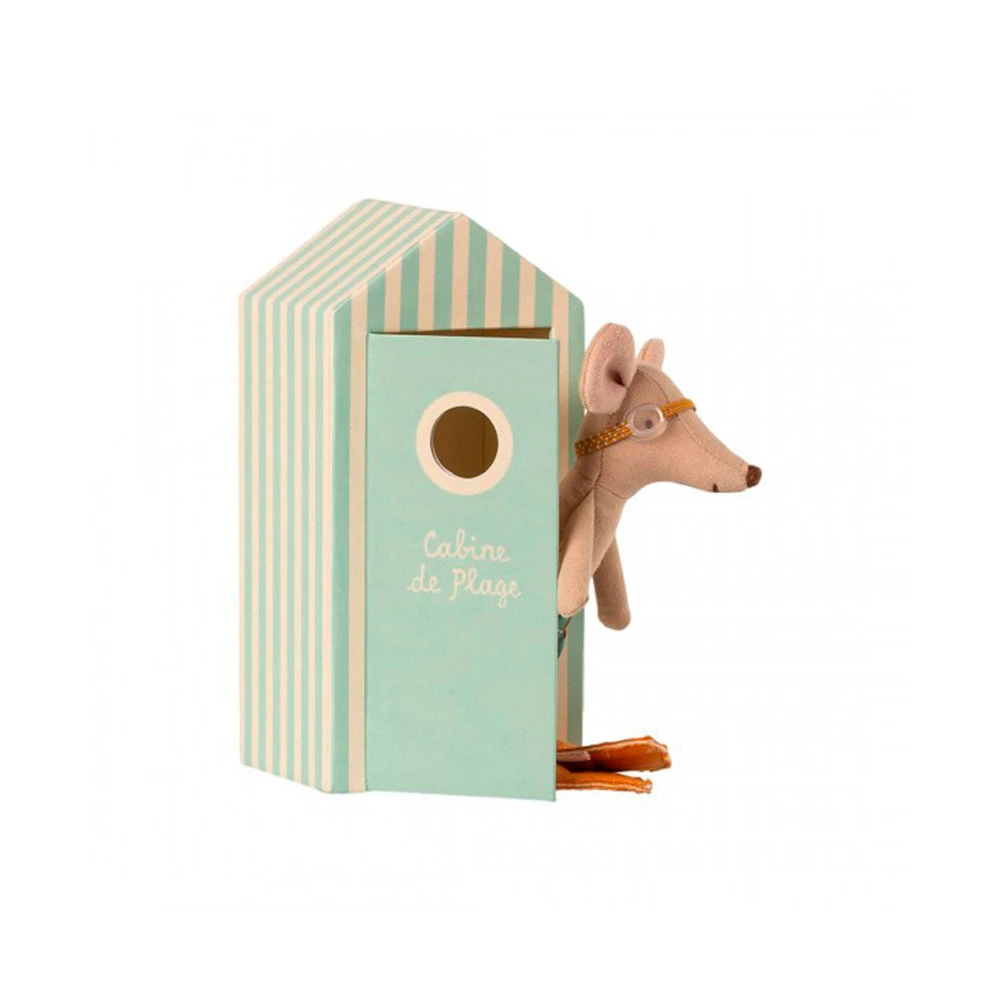 Vacation time. This little mouse is ready for a day at the beach, with all the necessary accessories and a beautiful striped beach house.
