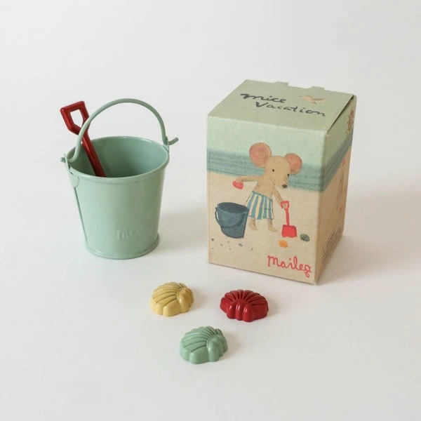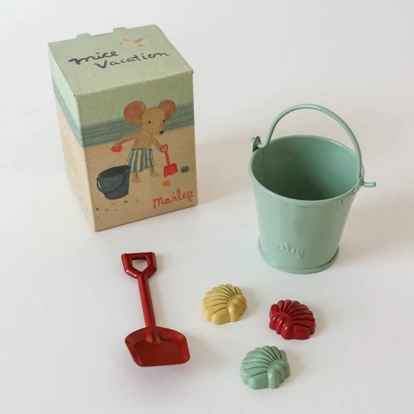 Vacation time. The perfect play set for the beach. A bucket, shovel and miniature sand toy are included. Size: – Height: 9 cm Width: 7 cm Age: 3 YR + Wash: Surface wash Material: Metal Filling: –