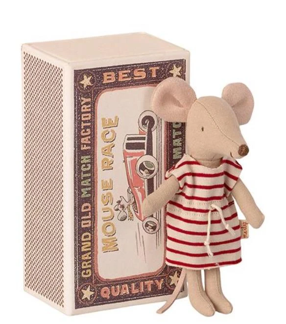 A comforting companion for children big or small, you always have a friend in a Maileg matchbox mouse. This little lass is wearing her very best breton dress and is ready for all kinds of adventure. She will play and play all day before its time to be tucked into her cozy little bed once more. Dimensions: mouse 12cm, matchbox 14 x 8 cmMaterial: mouse- cotton, matchbox- cardSuitable for ages 3+. Machine washable at 30º Founded in Denmark by designer and illustrator Dorthe Maili, Maileg have been providing timeless toys you won’t want to tidy away since 1999. Six time winner of the biannual Formland award for their unique nordic design, Maileg care not only about the quality of their product but also for the impact they have on the environment and are working towards the 17 Sustainable Development Goal set out by the UN to keep giving back to the world we live in.