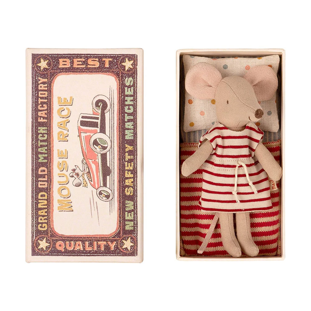 A classic Maileg item. This mouse is ready for hours of play and sleeps tight in a little matchbox. The clothes and bedlinen are made of soft fabrics with unique prints and beautiful colors.