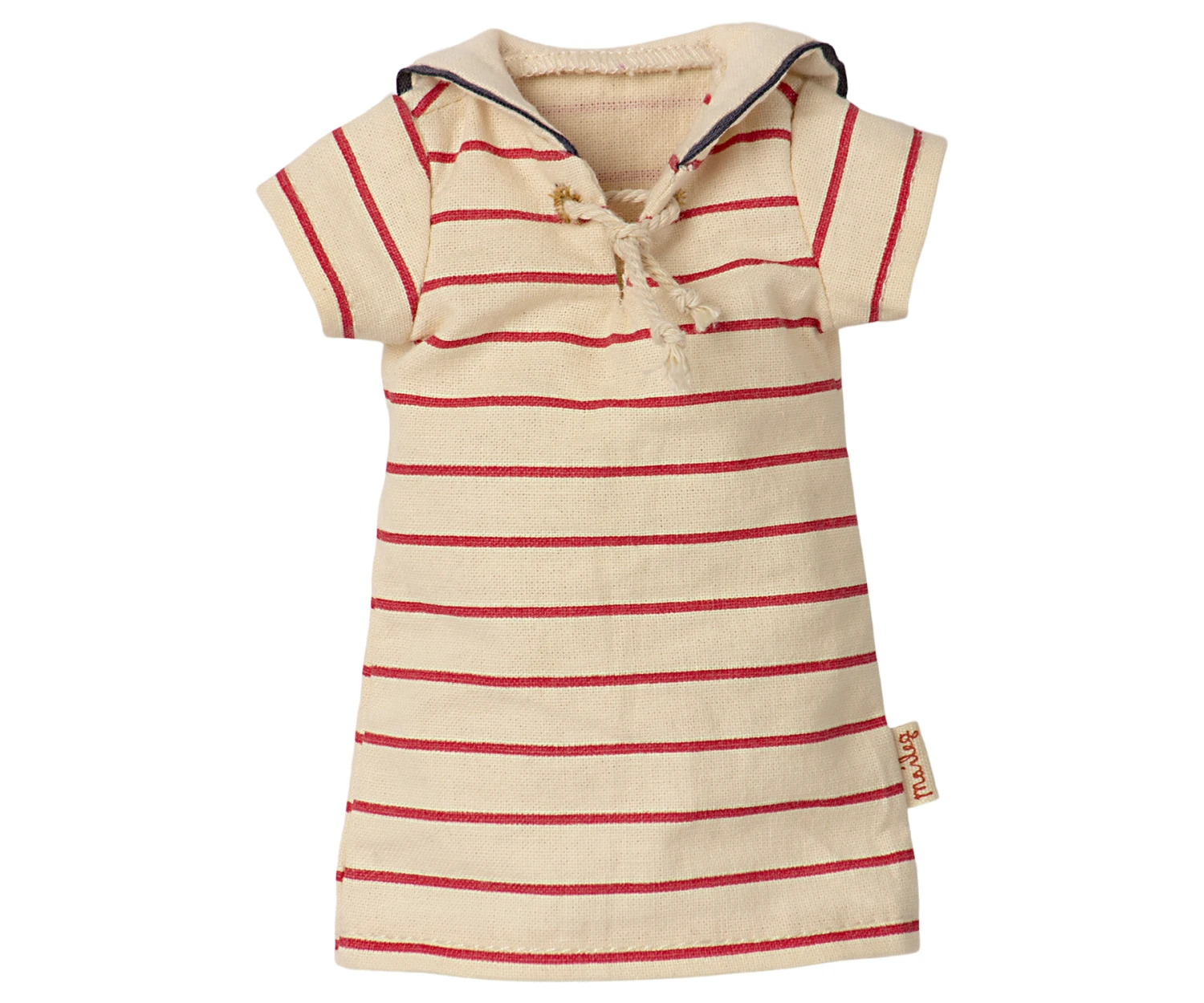 Ready for the seaside in a sporty red striped sailor dress, the summery bunny from award-winning Danish company Maileg joins an adorable family of rabbits and mice this season. With long floppy ears in soft linen and beautifully detailed cotton outfit, this smaller-sized bunny is irresistibly sweet and petite enough to pop in your bag or pocket.