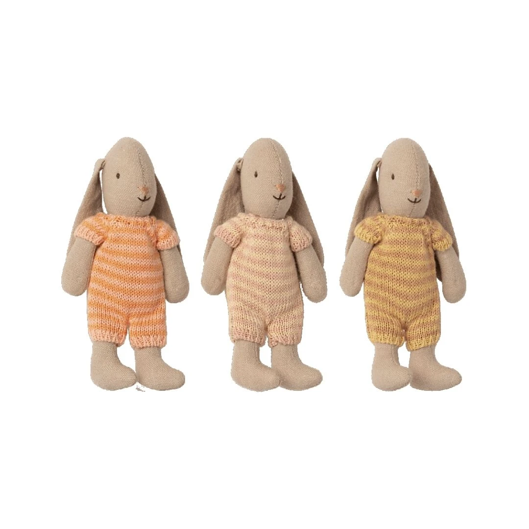 Si te gusta la colección de Maileg estos encantadores conejitos no te dejarán indiferente. Tienen las orejas hacia abajo y llevan un bonito pijama de punto a rayas en dos colores. Gracias a su tamaño, puede llevarlos a todas partes y ponerlos en su cuna o silla de paseo.