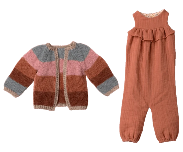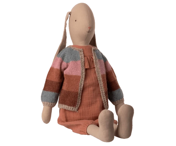 Bunny size 5 64cm Cotton/ linen suitable for all ages This gorgeous large bunny & is made of soft natural linen & cotton fabric – which gives a lovely handfeel and look. This bunny is dressed in a very feminine jumpsuit and a beautiful knitted sweater. By Maileg.