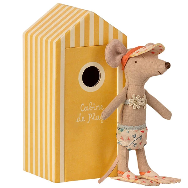 La nueva colección de verano de Maileg es encantadora. Tienen todos los detalles para disfrutar de un maravilloso día de playa. En este caso la hermana mayor tiene su cabina para cambiarse de cartón resistente en rayas amarillas y crema. La hermana mayor lleva un encantador bikini con margaritas en la parte de arriba y flores estampadas en la parte inferior. Ella también quiere bucear y lleva las aletas con topos en color rosa.