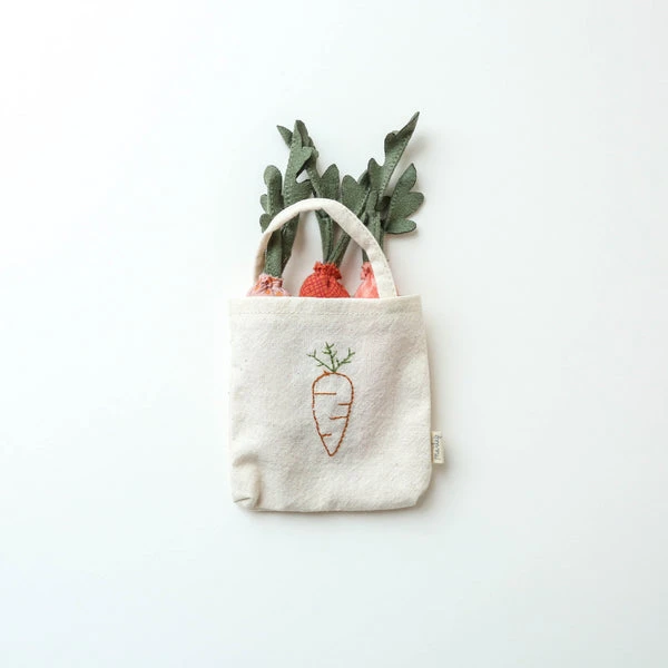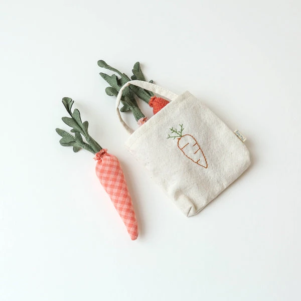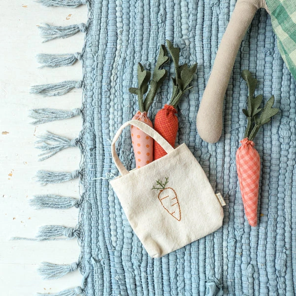 All the rabbits’ & bunnies’ favorite snack. This little bag contains three carrots and is all in Maileg fabric. A sweet accessory that will encourage even more play. Maileg is a brand of charming Danish-designed toys created to inspire our children’s favorite playtime stories. By bringing storybook whimsy to everyday moments, Maileg toys help children explore the pure and simple wonder of imagination. Beloved for their heartwarming personalities, Maileg toys show playfulness and charm in every last detail. Theirs is a timeless world filled with beautiful accessories and settings to be collected, cherished and shared with friends and family for generations. Size: N/A Height: 14 cm Width: 8 cm Age: 3 YR + Wash: 30°C Material: Cotton Filling: –