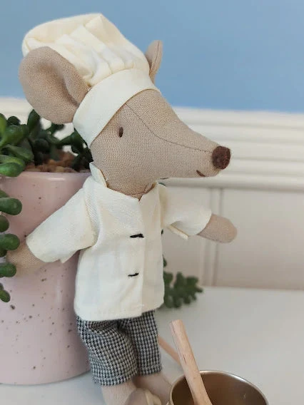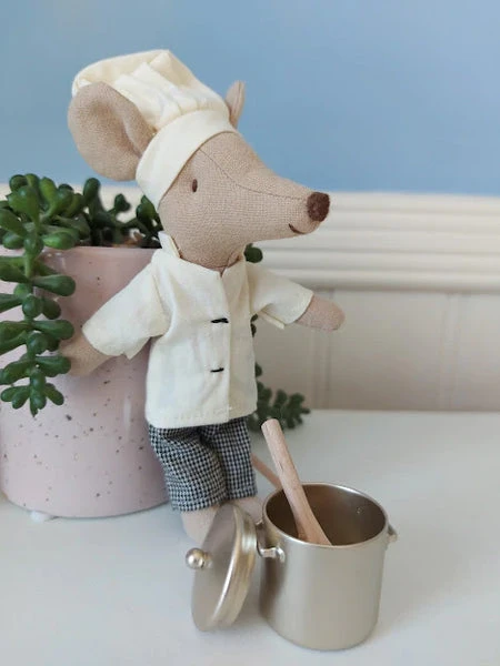 Mr Michelin Mouse – with his very own soup pot and spoon! He will cook for all your friends Maileg chef mouse Mr Michelin is a whizz in the kitchen. Dressed in his full chef regalia he loves to feed all your Maileg friends and throws lavish parties at his swanky restaurant. He’s always cheerful and knows all the best recipes. Material: Cotton Size: 12cm Suitable for 3+ years Hand washable at 30 degrees Maileg mice are made from natural materials and to a very high standard, so make great keepsakes and are perfect to hand down to the next generation