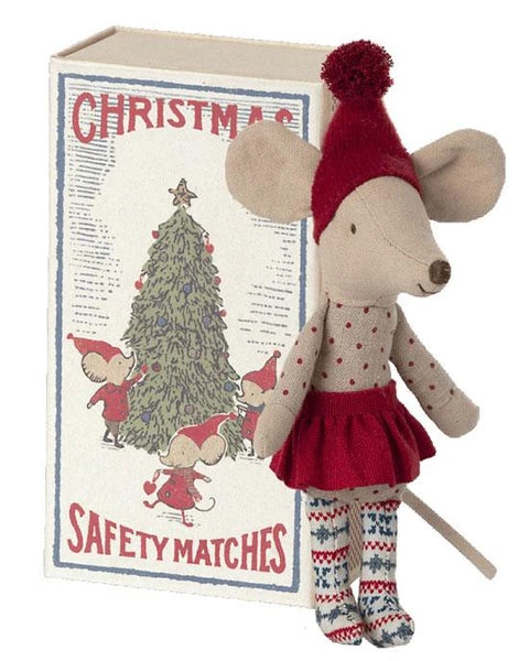 Big Sister mouse is ready for Christmas with her Fair Isle patterned tights and red skirt! Tuck her up tight in her little matchbox, with super soft bedlinen, she’s all ready for a cosy night’s sleep waiting for Father Christmas! Size : Big sister / Big brother mouse Height : 16 cm Age: All ages Washing instruction: 30 degrees Material: Cotton / Linen Pleas note – fabrics may vary Your Maileg mouse will become a truly treasured toy. These beautiful mice are a mix of Scandinavian design and old fashioned nostalgia. The mice are made from cotton, linen and even have a leather tail. These timeless toys are ideal for handing down for the next generation to love.