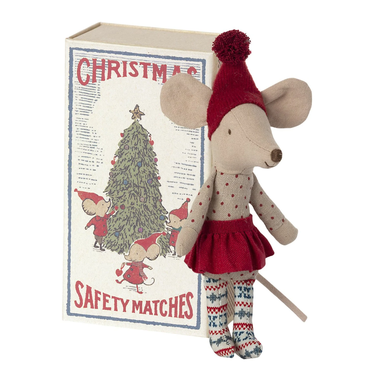 The Big Sister Christmas Mouse from Maileg comes in the beautiful matchbox, where she sleeps on the soft bed linen and a cute plaid pillow. She comes dressed with a cute removable hat and a red holiday striped skirt. Size: Medium Height: 13 cm Age: + 3 Years Washing instruction: 30 degrees Material: Cotton/Linen
