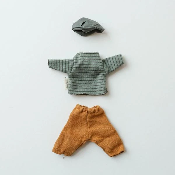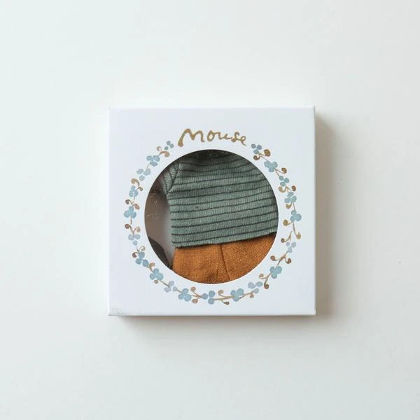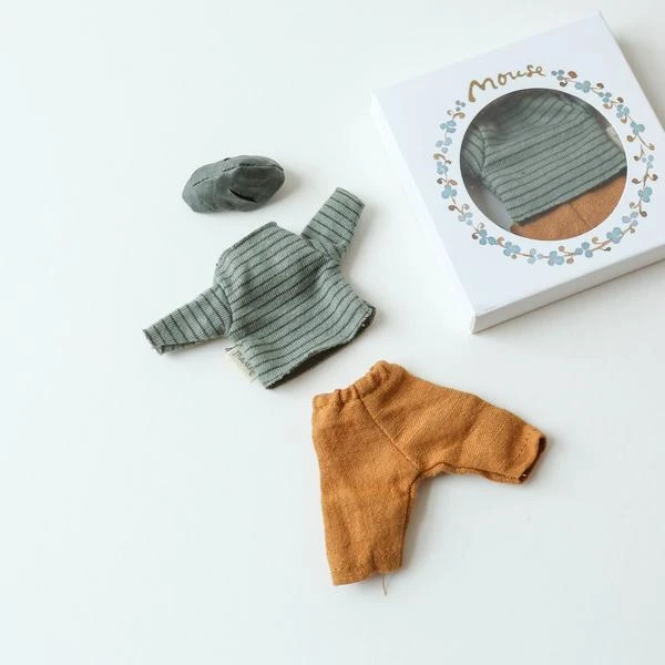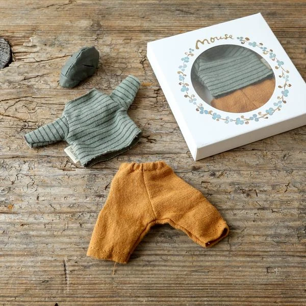 Casual trousers and a soft striped sweater for Dad mouse. Maileg is a brand of charming Danish-designed toys created to inspire our children’s favorite playtime stories. By bringing storybook whimsy to everyday moments, Maileg toys help children explore the pure and simple wonder of imagination. Beloved for their heartwarming personalities, Maileg toys show playfulness and charm in every last detail. Theirs is a timeless world filled with beautiful accessories and settings to be collected, cherished and shared with friends and family for generations. 1 cm heigh, 9 cm width Size: Big sister/brother Age: 3+ Recommended age 3+ Materials: Cotton/Linen Wash at 30°C