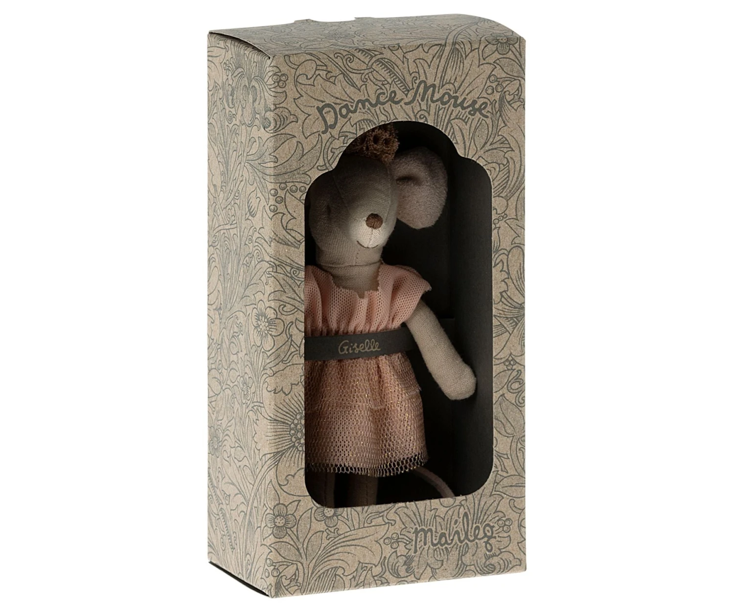 Your little ones will love this adorable Maileg Big Sister Giselle Ballerina Mouse. At just 13 cm, this sweet mouse has a long thin leather mouse tail and hand stitched features. She is wearing a pretty pink dress with tulle over skirt and an elasticated headband with a corsage, while magnets in her paws enable her to hold her dance positions. Swan Lake and Mira Belle dance mice are also available as well as separate dance costumes. The quality and details in this lovely Maileg toy really will make it a unique and well loved gift.