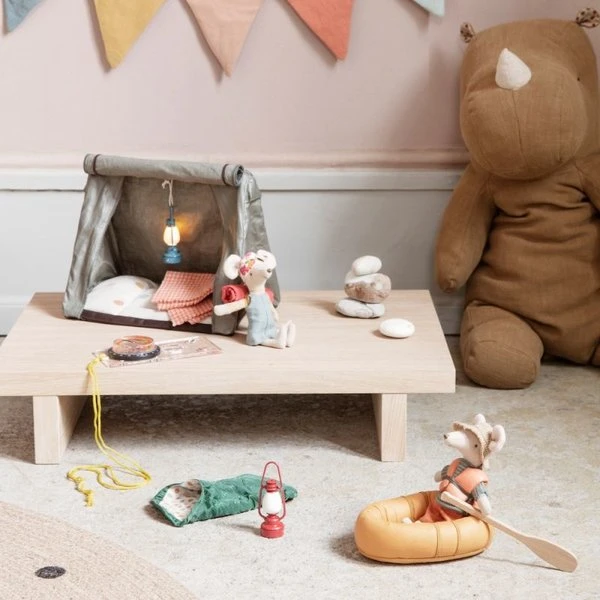With this Happy camper tent the Maileg mice go happily on holiday. Fold out the tent and you’re done! The bottom is a soft mattress, with a warm blanket. The camping tent is suitable for Maileg mice and micro rabbits up to 20 cm.