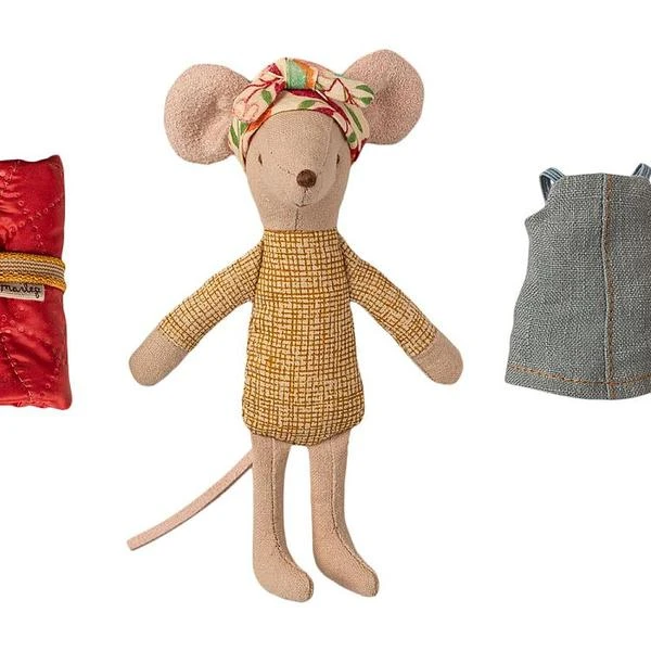 Size : Big sister / Big brother mouse Height : 12 cm Age: All ages Washing instruction: 30 degrees Material: Cotton Go on imaginary or real hikes with Mialeg’s Hiker big sister mouse. She’s kitted out with her sleeping bag, blue dress and colourful on trend bandana.