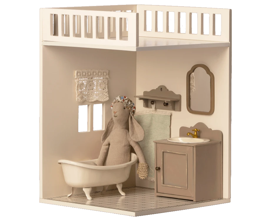 The Maileg Miniature Bathroom comes with a nicely decorated floor. In the box you will find 2 small curtains that will keep your Maileg friends private. Height: 30 cm Width: 26 cm Age: +3 Year Wash: Surface wash Material: FSC Wood