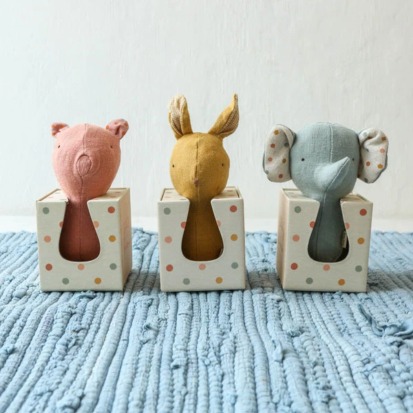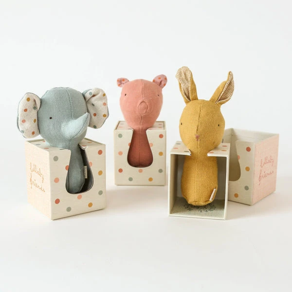 Lullaby friends is a collection of beautiful items for babies. This rattle is perfectly shaped for a small hand and has a stimulating rattle sound. It is made in soft fabrics with unique prints and is packed in a beautiful giftbox. Maileg is a brand of charming Danish-designed toys created to inspire our children’s favorite playtime stories. By bringing storybook whimsy to everyday moments, Maileg toys help children explore the pure and simple wonder of imagination. Beloved for their heartwarming personalities, Maileg toys show playfulness and charm in every last detail. Theirs is a timeless world filled with beautiful accessories and settings to be collected, cherished and shared with friends and family for generations. Item No.: 16-1911-00 Size: – Height: 13 cm Age: All ages Wash: 30°C Material: Cotton/Linen Filling: Recycled polyester