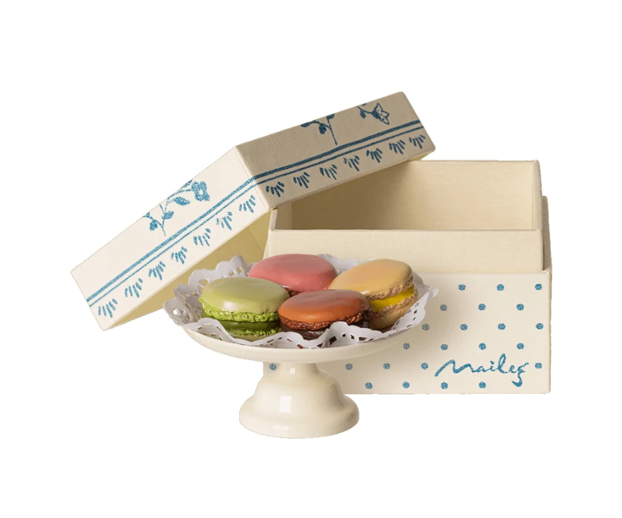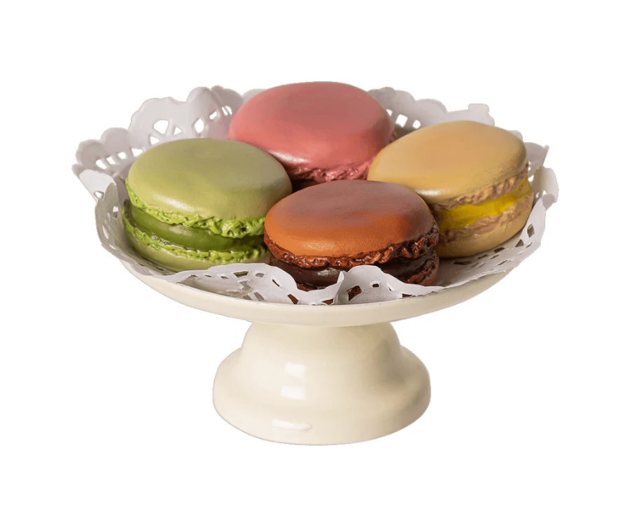 Les délicieux macarons sur le joli présentoir à gâteaux peint à la main sont un must pour chaque table basse. La boîte comprend également de petites serviettes en papier décoratives – Vous pouvez les utiliser sur l’assiette au moment de servir.