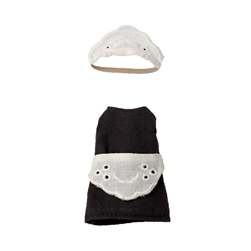 Maileg maid clothes for mouse includes a dress with apron and a headband. Outfit comes in a gift box. Fits big sister/brother mouse (12cm) Suitable 3 years+