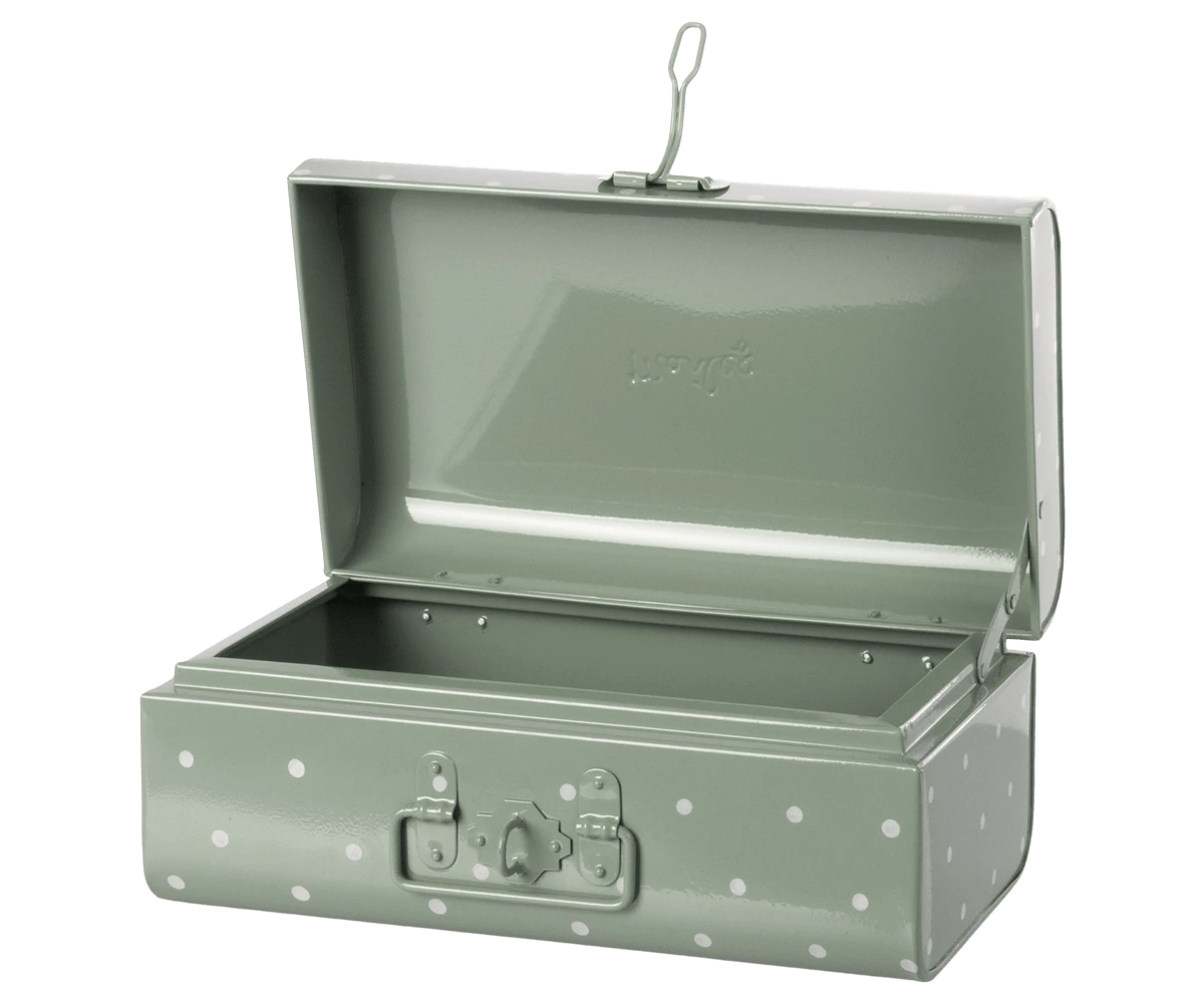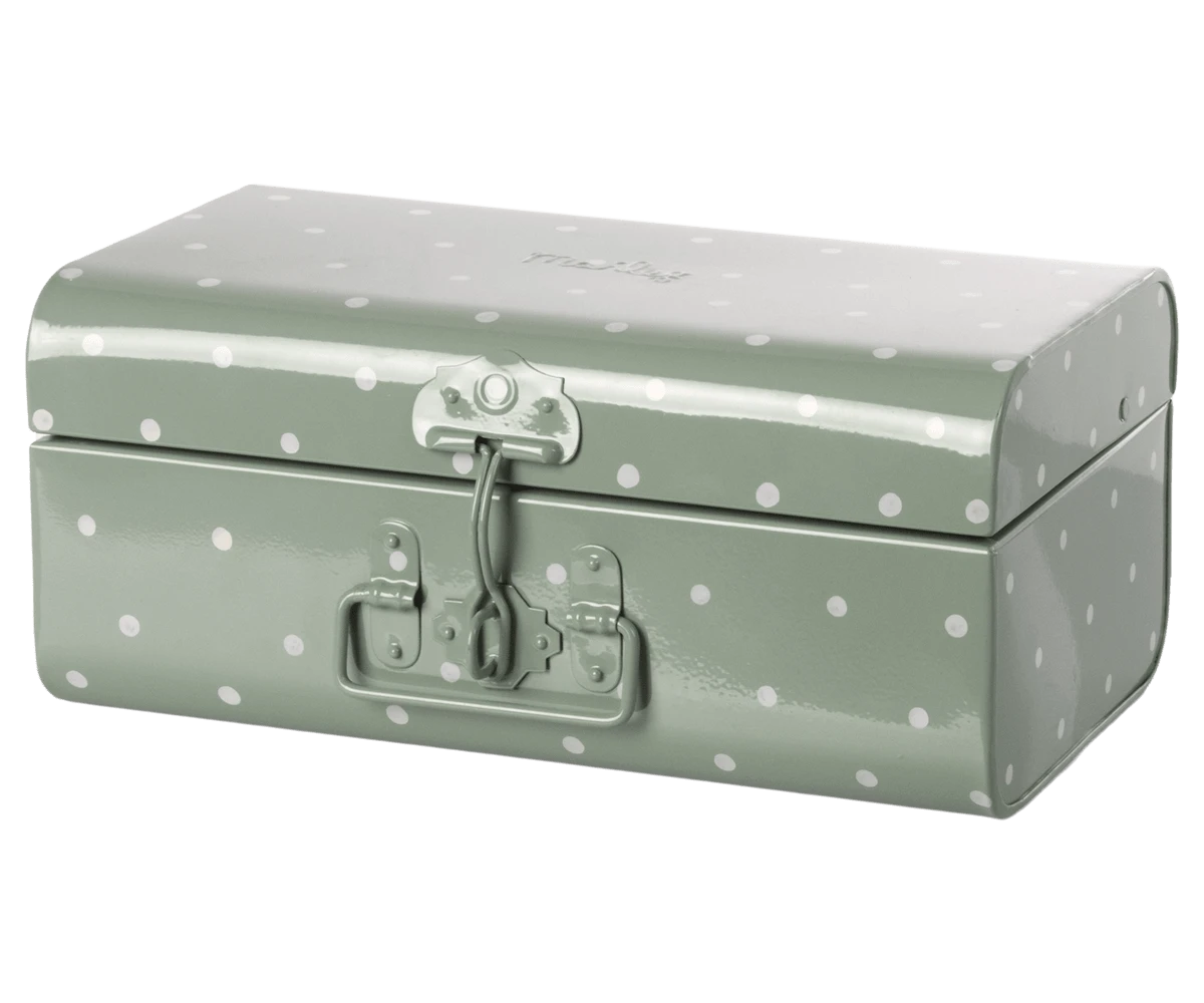 Preciosa maleta de almacenamiento en color verde pastel de topos blancos de Maileg. Es ideal para poner en la habitación y que los más pequeño guarden sus juguetes a la par que decora el entorno.