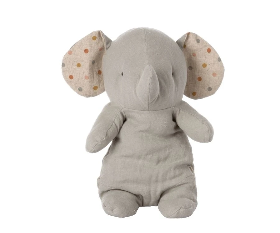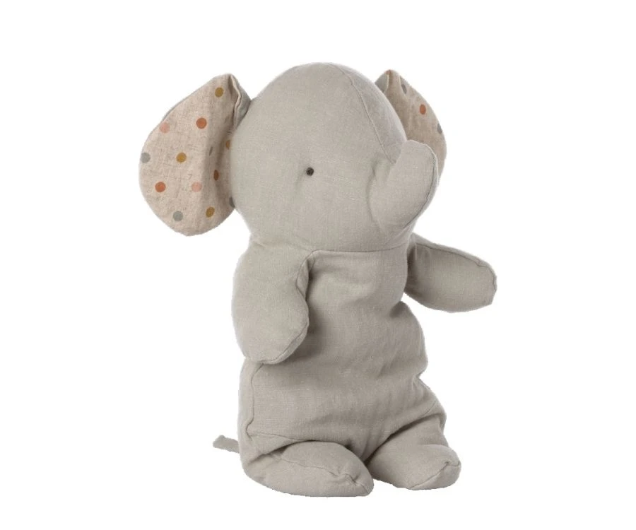 Der knuddelige graue Elefant ist aus gewaschenem grauen Leinen und greift sich besonders angenehm an. Ein richtiger Spielgefährte mit dem du durch Dick und Dünn gehen kannst. Die Schlapperohren sind mit gepunktetem Stoff gefüttert. Die weiche Füllung ist aus recyceltem Polyester eine Ladung Granulat im Hinterteil erleichtert das Sitzen. Höhe: 34 cm Material: Leinen/Füllung aus recyceltem Polyester Granulat Farbe: Grau. Altersempfehlung: 0+