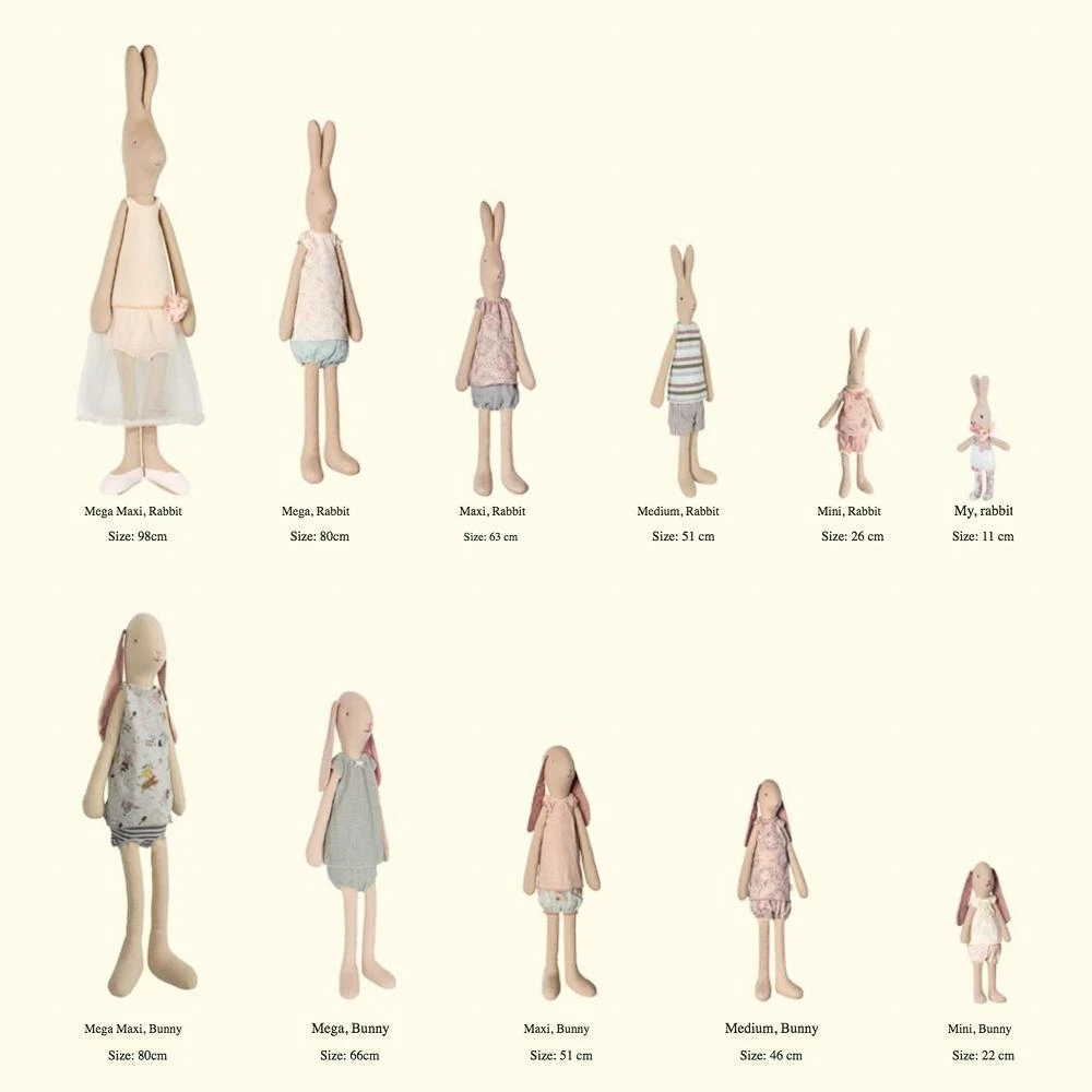 A mini rabbit from Maileg dressed in stripy shorts and a patterned t-shirt. He has a beanbag bum so it a lovely weight and can sit up by himself. Height 26 cm machine washable at 30