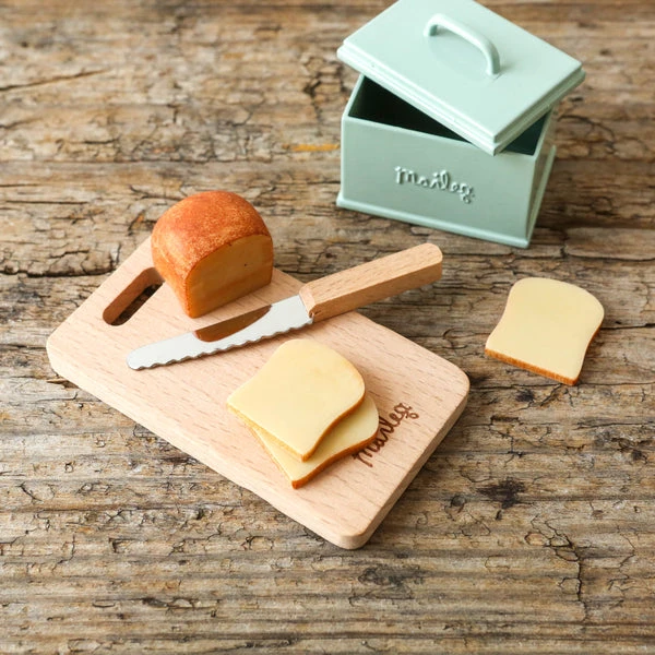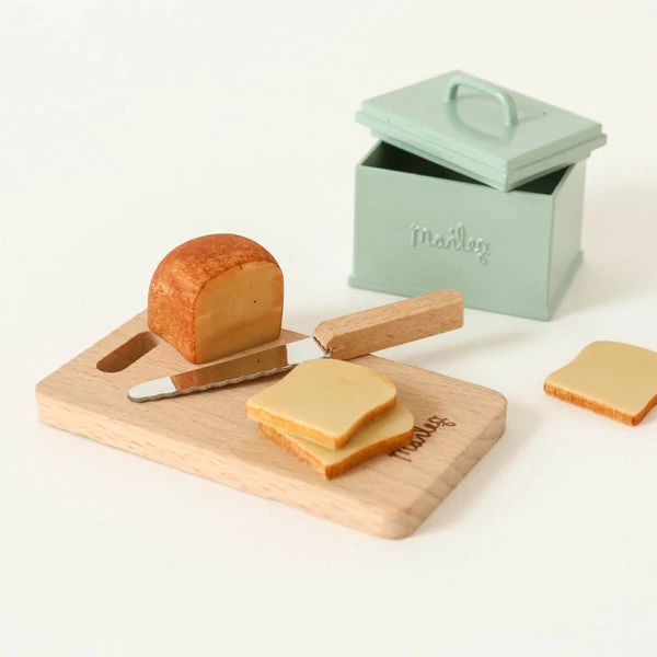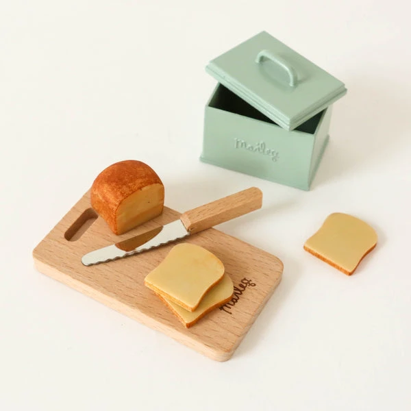 This miniature playset consists of a bread box, half bread and 3 slices, a cutting board, and a knife. It is made of metal, wood, and polyresin. It is the perfect start of a play in the miniature kitchen. Maileg is a brand of charming Danish-designed toys created to inspire our children’s favorite playtime stories. By bringing storybook whimsy to everyday moments, Maileg toys help children explore the pure and simple wonder of imagination. Beloved for their heartwarming personalities, Maileg toys show playfulness and charm in every last detail. Theirs is a timeless world filled with beautiful accessories and settings to be collected, cherished and shared with friends and family for generations. Size: – Height: 4 cm Width: 8 cm Age: +3 Year Wash: Surface wash Material: WOOD/METAL/POLYRESIN