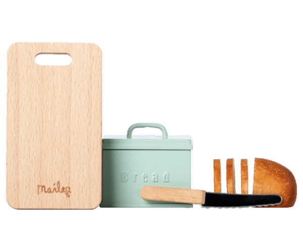 This miniature playset consists of a bread box, half bread and 3 slices, a cutting board, and a knife. It is made of metal, wood, and polyresin. It is the perfect start of a play in the miniature kitchen. Age: 3 YR+ Bread Bin: H: 4cm / W: 8 cm Wash: Surface Wash Material: Wood / Metal / Polyresin