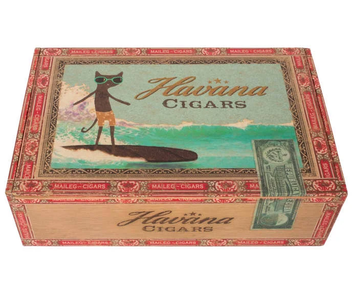The cigar box is a perfect bed for a good night’s sleep and sweet dreams because it is equipped with beautiful 100% cotton sheets: a striped mattress, two yellow checkered pillows and a blue and gray striped knitted blanket.