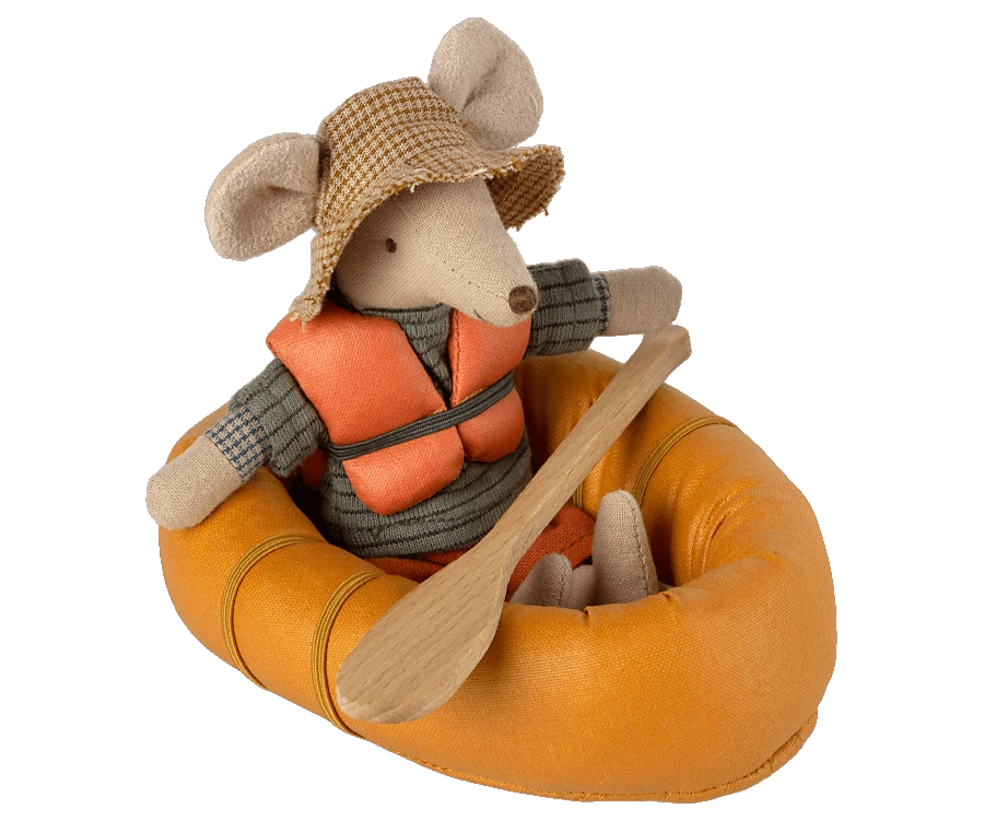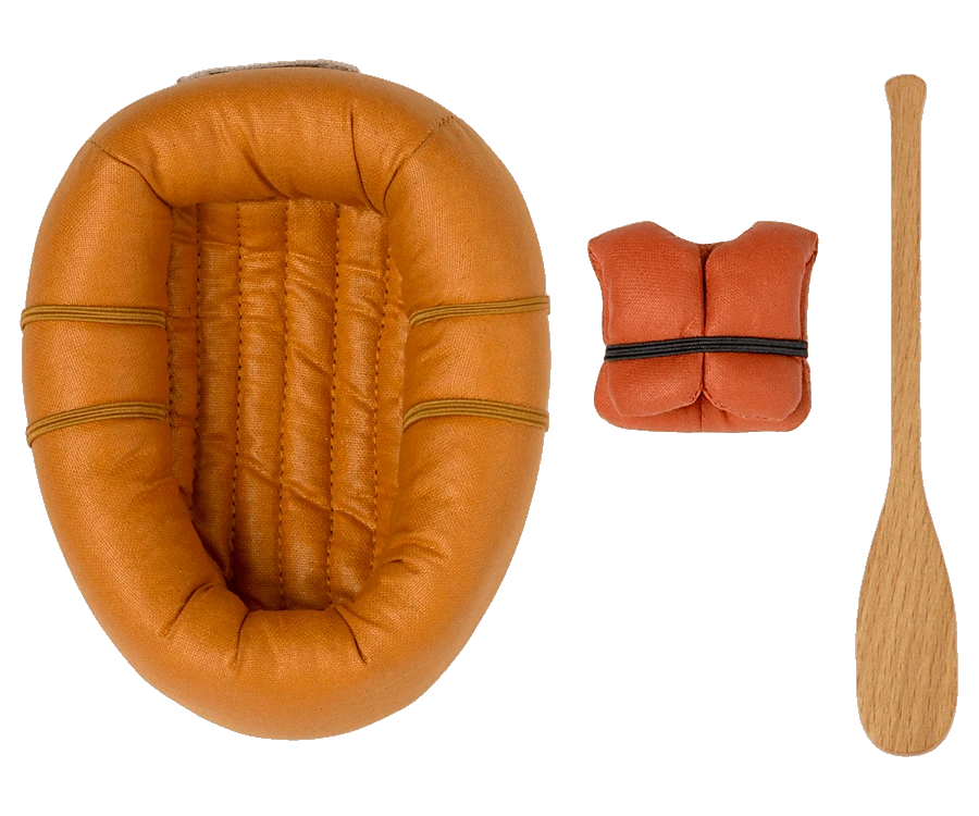 This little rubber boat is made of fabric and comes with life west and paddle as well. It is not water proof, so you have to imagine floating on the water. This set fits all mice sizes. Mouse not included Height- 4cm. Width- 12cm. Materials- Cotton, FSC Wood & Recycled Polyester filling. Not suitable for children under 36mths.