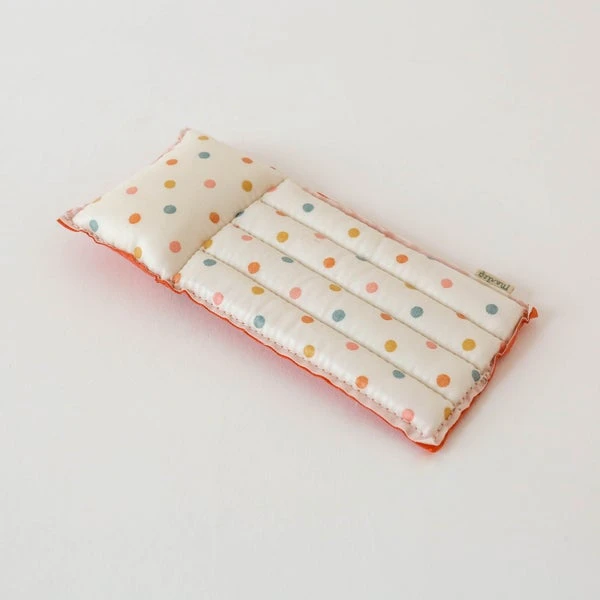 Vacation time. An air matress made in coated fabric for an authentic look. It is not water proof, so only play on dry ground… only in your imagination it can float on water. This set fits all mice sizes. Size: Mouse Height: 1 cm Width: 13 cm Age: 3 YR + Wash: 30°C Material: Cotton Filling: Polyester
