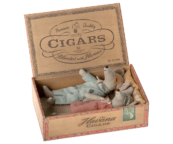 Mother/Father mouse Height:17 cm Recommended age:+3 Year Wash:30°C Material:Cotton/LinenFilling:Recycled polyester/Pe Pellets A classic Maileg item. Mom and Dad mice are wearing their beautiful nightwear and eye masks. The cigar box is a perfect bed for a good night’s sleep and sweet dreams.