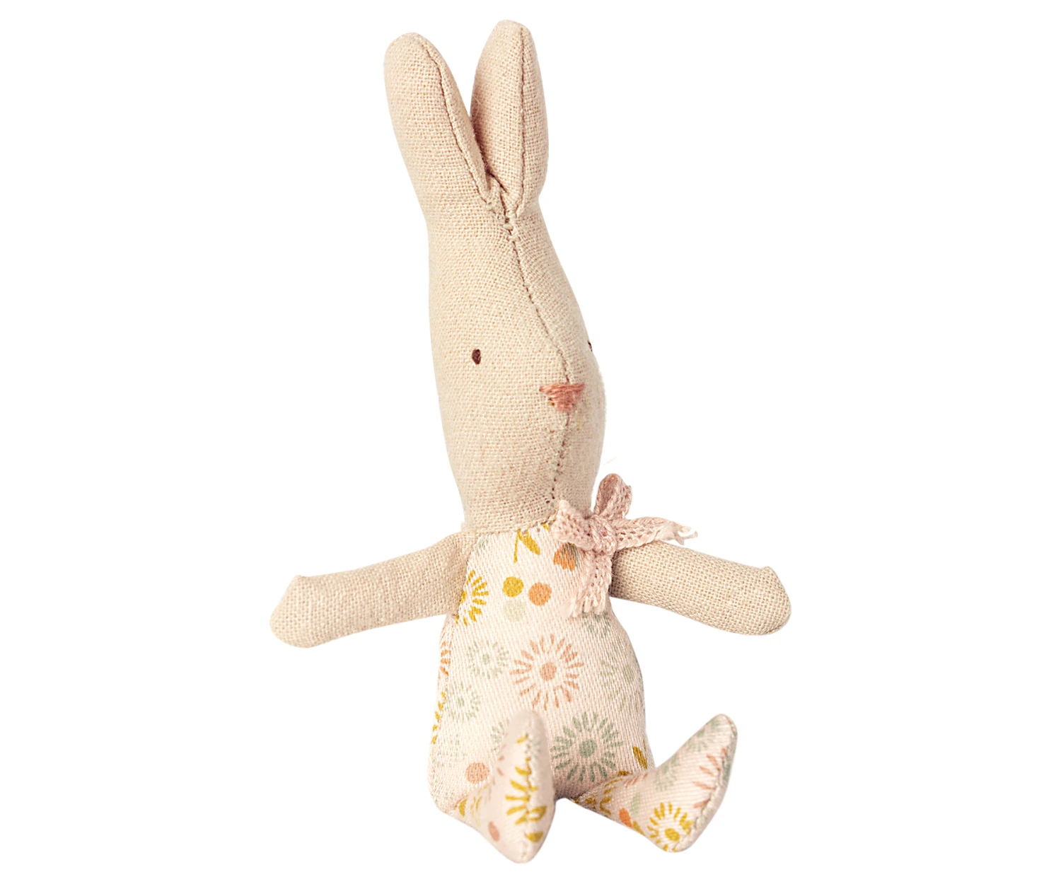 Introducing our teeny tiny size called My. My rabbits are the cutest size yet designed. This little rabbit is in the latest outfit design of the season – swirly printed fabric with a cute bow in pink. There is a whole range of furniture designed for them too including My sized prams, high chairs, carry cots and bouncing chairs.
