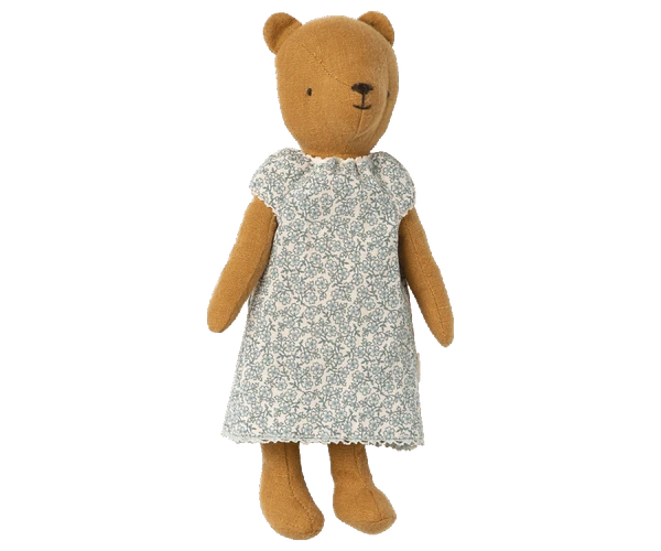 Dress Teddy mum for a good night`s sleep or a cosy pyjamas party with this night gown. Size: Mum Teddy Height: 12.5cm Age: All ages Width: 10.5 cm Wash: 30 degrees Material: Linen