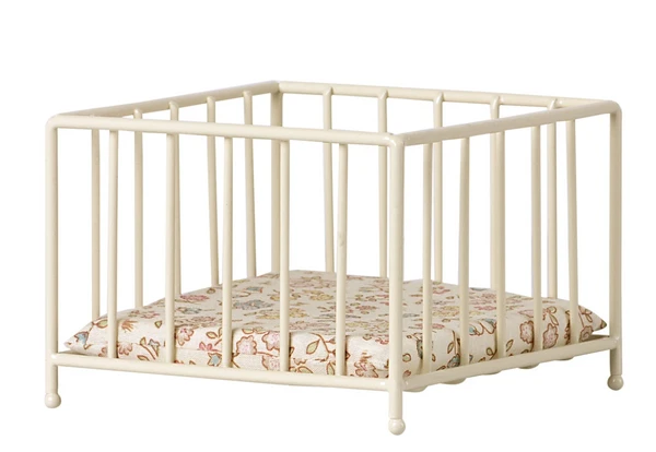 Keep your baby rabbits and mice safe in this sweet playpen. The playpen is in metal and painted in a soft off-white tone. In the bottom is a soft mattress covered with unique Maileg fabric.