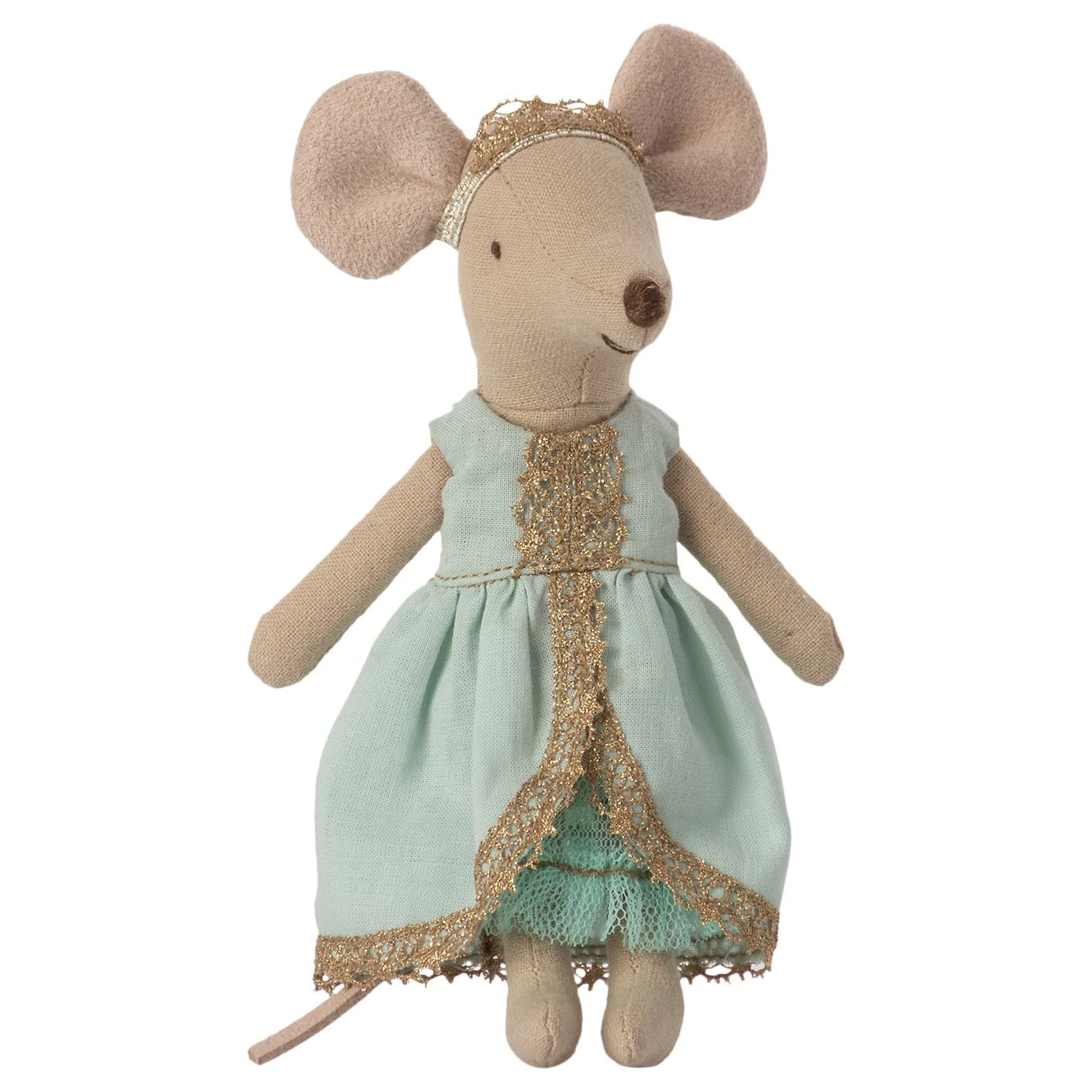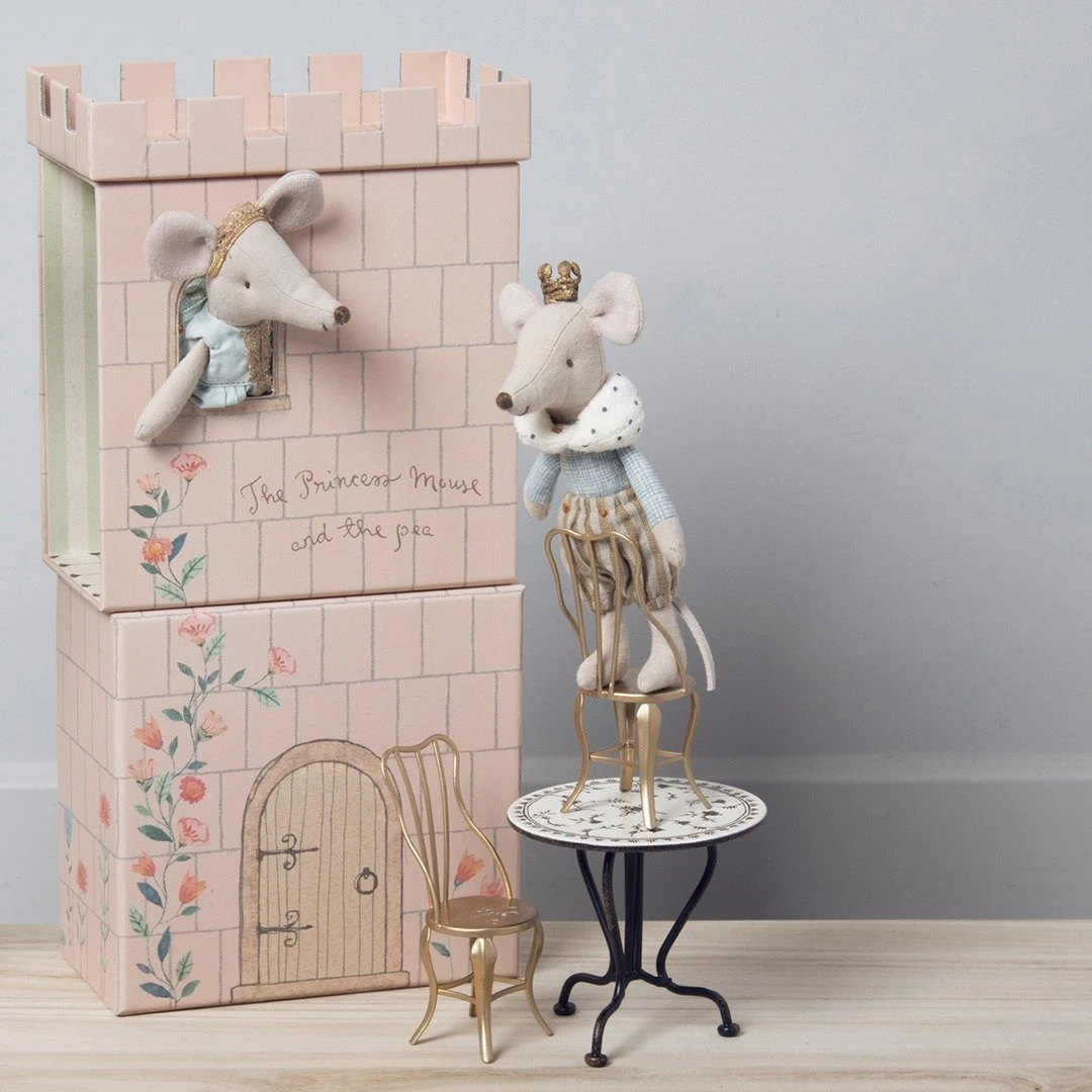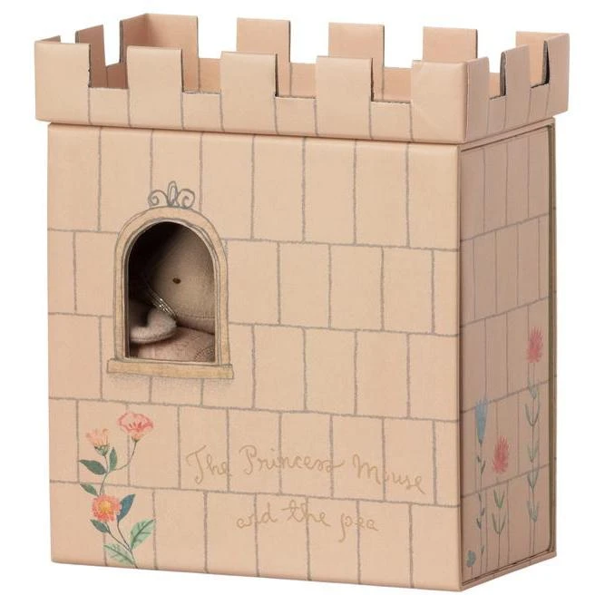 Once upon a time… Playset from Maileg, inspired by the famous fairy tale Princess and the pea. This set includes a paper castle with mattresses, a pea and a princess mouse. Size: Big sister / Big brother mouse Height: 17 cm Age: All ages Washing instruction: 30 degrees Material: Cotton