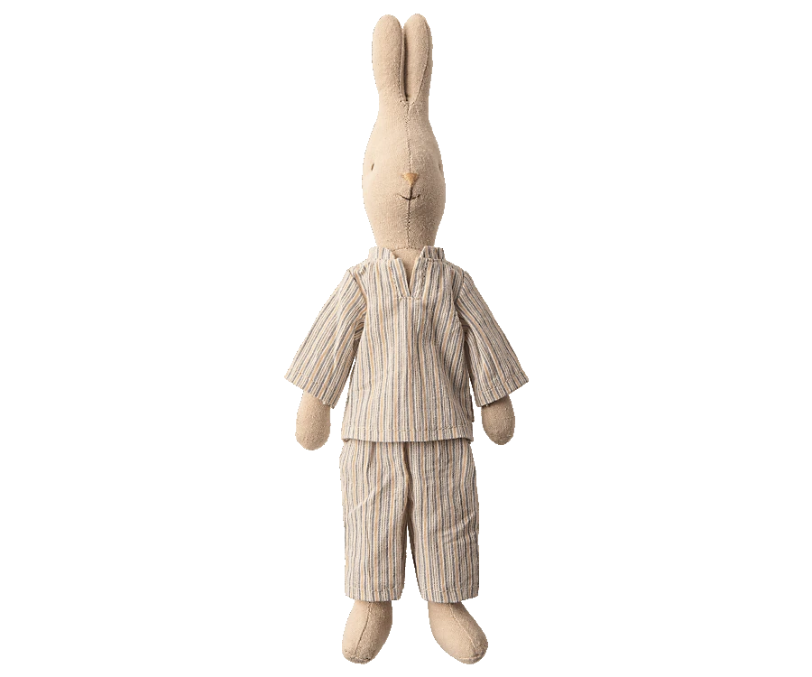 Dress your bunny or rabbit for a good night`s sleep or a cosy pyjamas party with this striped pyjamas. It fits size 2. Product details Size: Bunny/Rabbit 2 Height: 0 cm Age: 3 YR + Washing instruction: 30°C Material: Cotton Maileg (pronounced My’lye) is a brand of charming Danish-designed toys created to inspire our children’s favourite playtime stories. By bringing storybook whimsy to everyday moments, Maileg toys help children explore the pure and simple wonder of imagination. Beloved for their heartwarming personalities, Maileg toys show playfulness and charm in every last detail. Theirs is a timeless world filled with beautiful accessories and settings to be collected, cherished and shared with friends and family for generations.