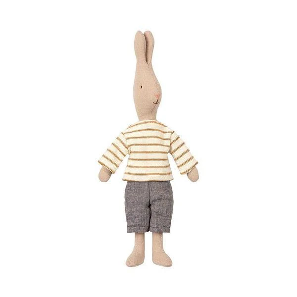 Maileg size: 2 Height: 32 cm Material: Cotton /Linen Washing Instruction: 30 C Suitable for all ages The Maileg bunny & rabbit collection is made of soft natural linen & cotton fabric – which gives a lovely handfeel and look. This rabbit is ready to sail the seas in a casual outfit.