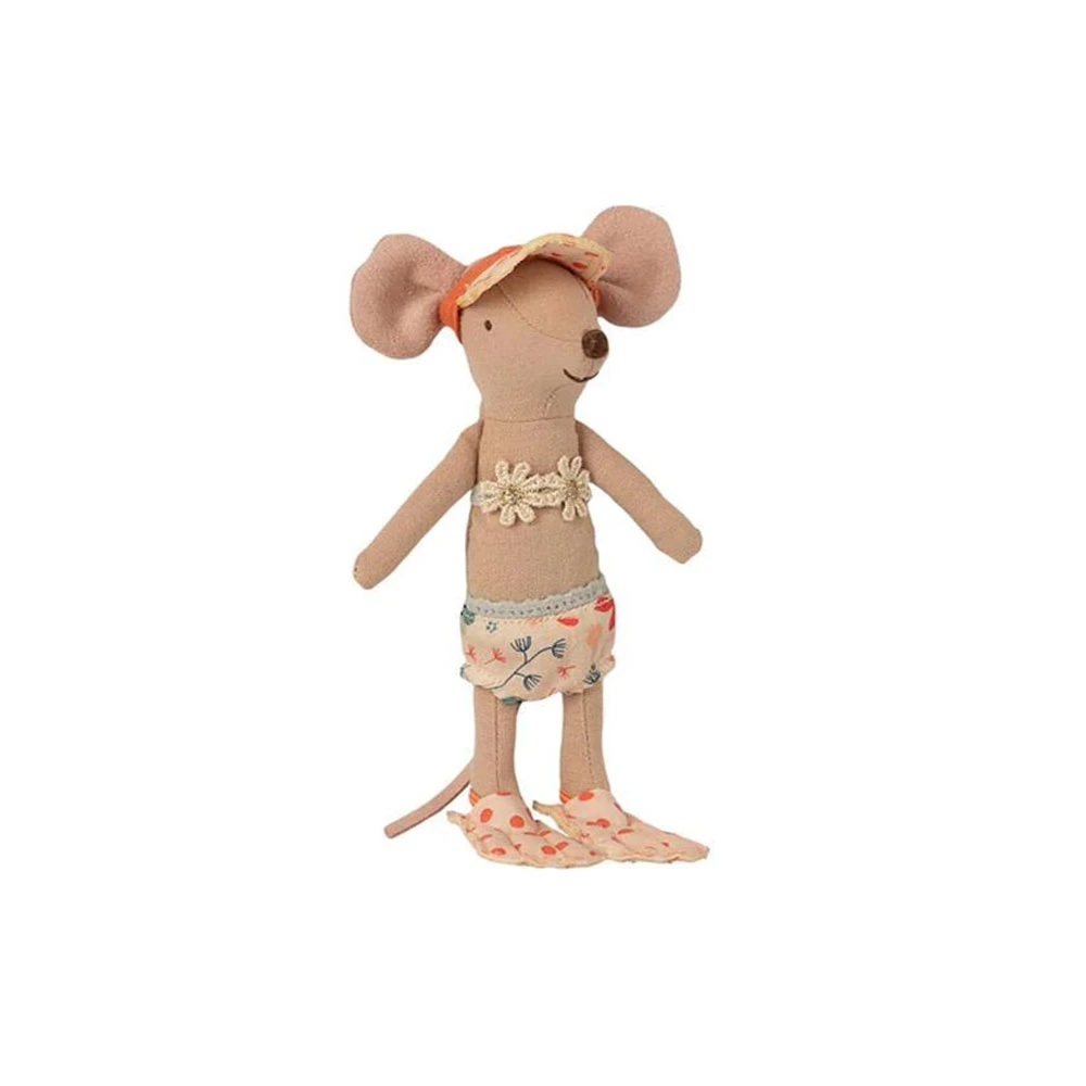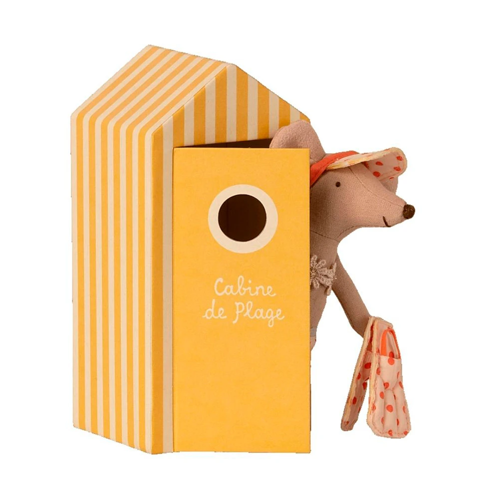 Tiempo de vacaciones. Esta ratoncita está lista para un día en la playa, con todos los accesorios necesarios y una hermosa casa de playa a rayas.