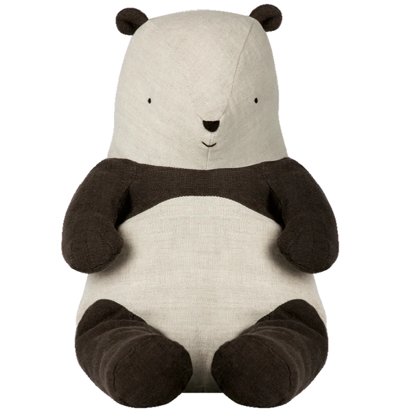 Soft linen Panda Bear by Maileg. Height 31 inches Suitable for all ages Washable at 30 degrees Made from linen with recycled polyester/ PE Pellet filling
