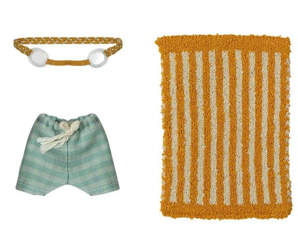 Ferienzeit. Dieses Set enthält alle wichtigen Accessoires für einen unterhaltsamen Tag am Strand: Badehosen, Schutzbrillen und ein Handtuch. Es passt alles perfekt zu den Mäusen in der Größe eines großen Bruders / einer großen Schwester. Größe: Große Schwester / Große Bruder Maus Alter: 3 Jahre und älter Waschen: 30 Grad Material: Baumwolle