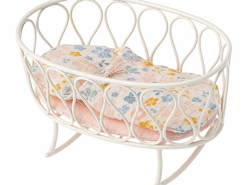 a beautifull designed cradle with a soft sleeping bag inside. The cradle is made of metal and you can easily rock you small soft toy into sleep.