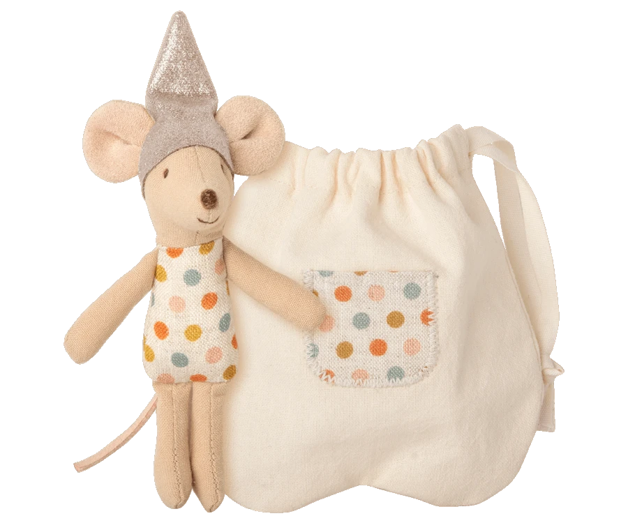 At night the tooth fairy spreads fairy dust, collects teeth, brings treats and makes sure you have sweet dreams. The mouse comes with a little bag. Product details Size: Little sister/brother Height: 10 cm Age: 3 YR + Wash: 30°C Material: Cotton/Linen Filling: Polyester/Pe Pellets Maileg (pronounced My’lye) is a brand of charming Danish-designed toys created to inspire our children’s favourite playtime stories. By bringing storybook whimsy to everyday moments, Maileg toys help children explore the pure and simple wonder of imagination. Beloved for their heartwarming personalities, Maileg toys show playfulness and charm in every last detail. Theirs is a timeless world filled with beautiful accessories and settings to be collected, cherished and shared with friends and family for generations.