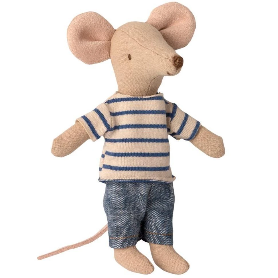 Topolino Fratello Maggiore – Maglietta a Righe Un grazioso topolino molto casual con jeans e maglietta a righe. Originale e spiritoso, come tutti gli altri personaggi del mondo Maileg. Ricco di dettagli, può essere collezionato con tutti gli altri topini Maileg della serie. Completano dei tessili a righe e cuscino a pois. Dettagli: materiale: 100% cotone dimensioni: 13 cm marca: Maileg