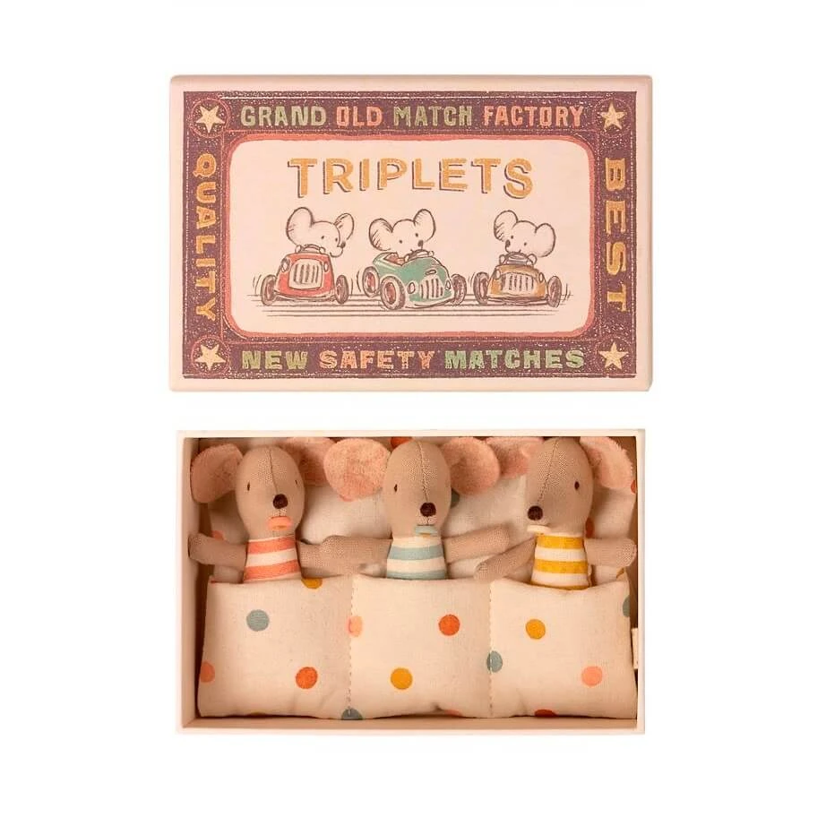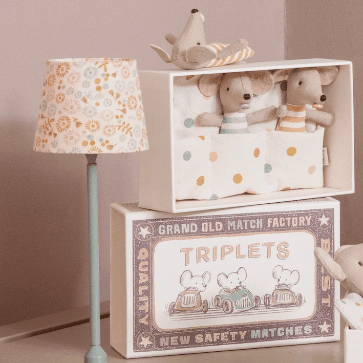 Maileg’s adorable baby triplets sleep in their matchbox bed with a beautiful light-colored polka dot blanket. Each baby mouse has a pijama color to match his pacifier. Baby mice are 8 cm tall. A lovely gift for our boys and girls to have fun playing and caring for.