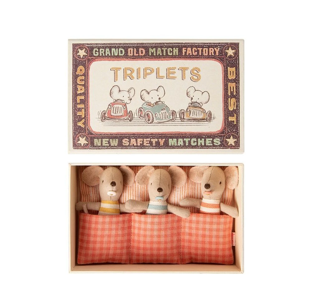 Now you can have 3 baby mice at the same time. The triplet baby mice are carefully tugged in their matchbox bed in the warm sleeping bag. They all have their own passifier and sleeps tight side by side.